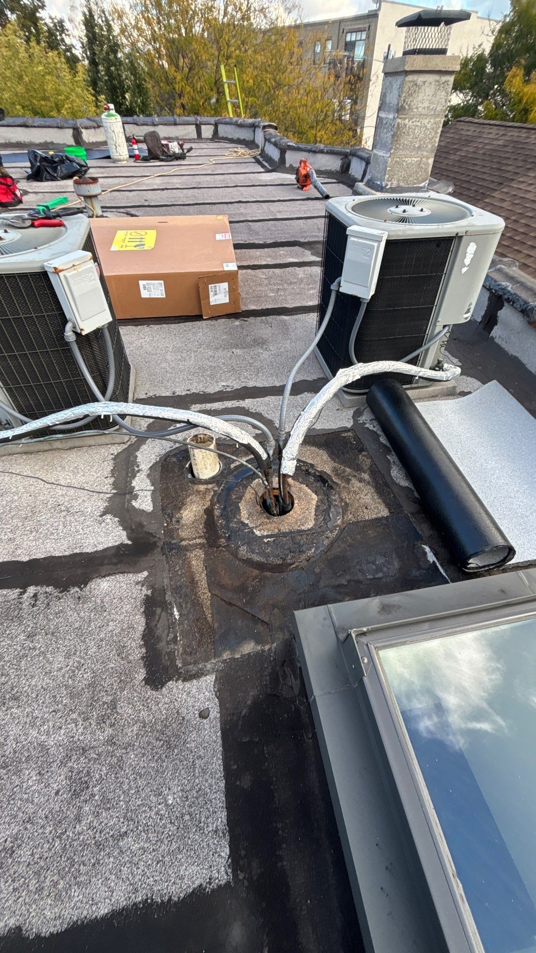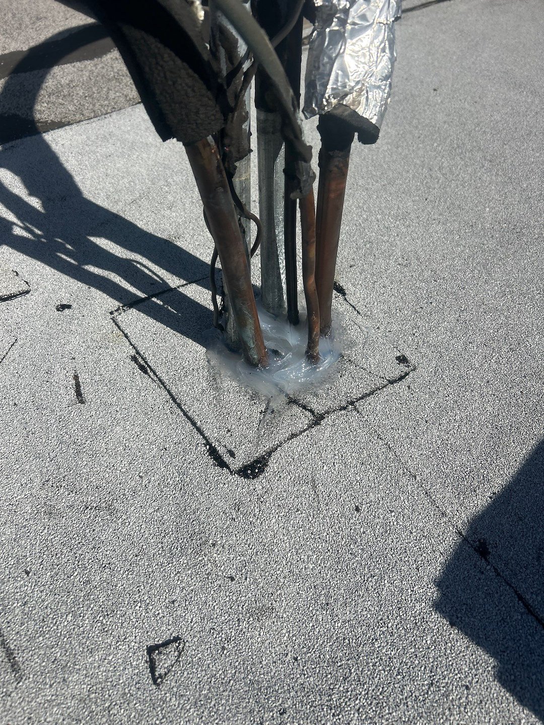 At Anchor Point Roofing, our commercial roofing team is addressing this issue by removing the existing HVAC portal and installing a properly fabricated metal pitch pan around the HVAC line set. This ensures that the penetration is securely sealed and can accommodate any movement or vibration from the unit itself.