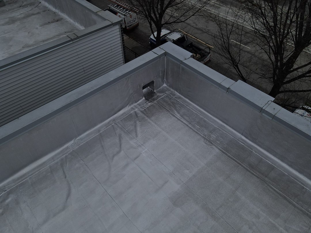 Finally, we will install new membrane that seamlessly matches your existing commercial flat roof system, whether it's TPO, granulated, or smooth modified bitumen membrane. Our goal is to create a durable, watertight seal that effectively channels water away from your building. For smooth modified bitumen, we also apply a protective aluminum coating for enhanced durability and UV resistance.